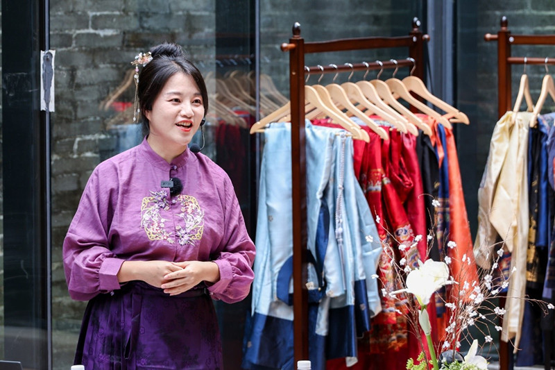 在豐收節活動現場,有一位特別引人注目的姑娘,她就是山夏1368酒店療愈師、非遺講師呂娜,呂娜身著一款頗具明朝特色的古裝服飾,正在體驗區為前來參加活動的遊客和村民們講解明朝禮制。