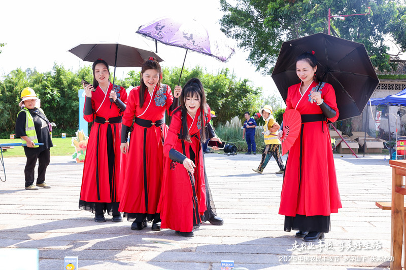 慶典現場,“慶農業豐收,享美好生活”的主題隨處可見。互動區裏,村民與遊客圍坐玩投壺、套圈,套中印有稻穗圖案的文創禮品時,歡呼聲此起彼伏;非遺區中,老手藝人指尖翻飛編織竹器,經緯間盡顯匠心;一旁的茶果子工坊內,遊客跟著師傅揉面、塑形,將羅浮山茶香融入軟糯點心,體驗傳統美食製作的樂趣。