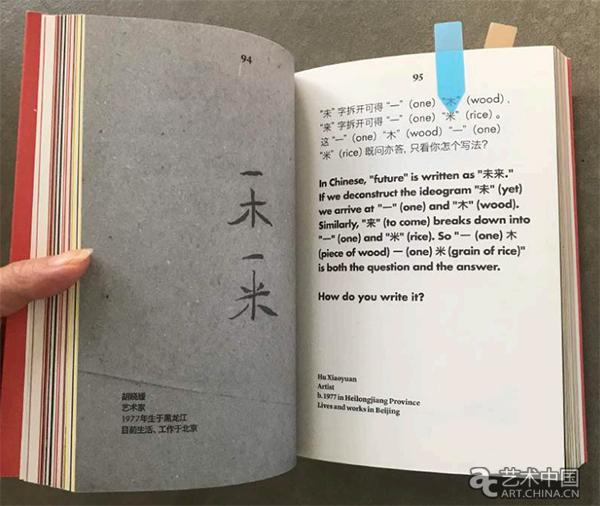 青年藝術家胡曉媛的作品《一木一米》作品看似簡單卻意蘊深遠。她在一本書的襯頁上,寫下“一木一米”。她將未來的“未”字拆解成一個木字,“來”字拆出一個“米”字。最後她寫到“既問亦答,只看你怎個寫法?”