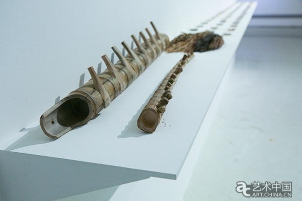 在展墻的一側,展示著來自貴州黎平縣地方農業物種保育場的作品《拾穗》。在自然環境豐饒的黔東南地區,保留著豐富的地方農業資源,2012-2017年,黎平縣地方物種保育場開展傳統物種收集工作,共採集到經濟作物23種,130個品種。觀眾首先被一組如脊椎骨一般的竹製品所吸引,在粗大的竹竿上,每塊竹節處都打出孔,上面密實地嵌著竹帽。王國慧介紹説,這是當地人用來貯存種子,以防止老鼠偷吃的容器。這件容器也展示了當地人對農作物資源的珍惜與愛,很多珍稀品種正是因為某位老人的堅持,才得以保留。