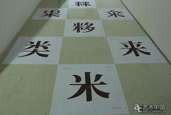 在一層的通道處,地上貼滿與糧食相關的“米”、“類”、“崇”等現行漢字和部分古漢字。這是朱琺、厲致謙遴選出八十八個有“米”偏旁的字,這些字包含生存必備、數進位制、長度單位、空間結構等各種形態語義。據項目執行人王國慧介紹,糧和糧、“米卜”在古代都代表“糧”,但偏旁“量”代表數量,“卜”指古人占卜祭祀。最終代表良好的“良”成為了最常用的糧字偏旁,這些選擇顯示了古人對糧食認知上的智慧。