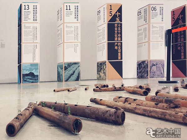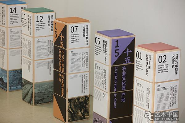 在展廳一層大廳裏立著幾根方柱,上面記述了浙江青田魚共生系統、江西萬年稻作文化系統、雲南哈尼稻作梯田系統、陜西佳縣古棗園等15個在中國的全球重要農業文化遺産的介紹資料。