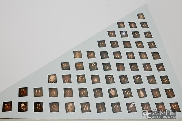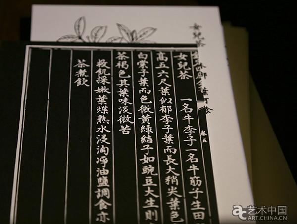 在二層展廳,有一個黑櫃立於墻根處,黑櫃的每個抽屜放置著植物插圖。這是厲致謙根據明代朱橚的《救荒本草》製作的裝置作品。朱橚是朱元璋第五子,出身帝王世家,卻無意政治,終日癡迷于研究中草藥。這本書教黎民百姓如何利用自然界的植物代替食品,以度荒年。該書首開野菜著述一門,對植物學、農學、醫藥學影響深遠。《救荒本草》的突出特點是圖文並茂,每種植物都配以精確美觀的版畫插圖,方便了不識字的百姓觀看,將實用性與藝術性融為一體。