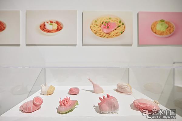 在展墻的一側挂著瑪瑞吉·沃格讚系列主題視頻。來自荷蘭的瑪瑞吉·沃格讚的作品《吃設計》系列充滿了對食品的深度思考與奇思妙想的科幻感。瑪瑞吉·沃格讚是全球第一位“吃-設計師”,她認為食物的外形只是講述故事的工具,她希望探索食物背後蘊藏的故事。