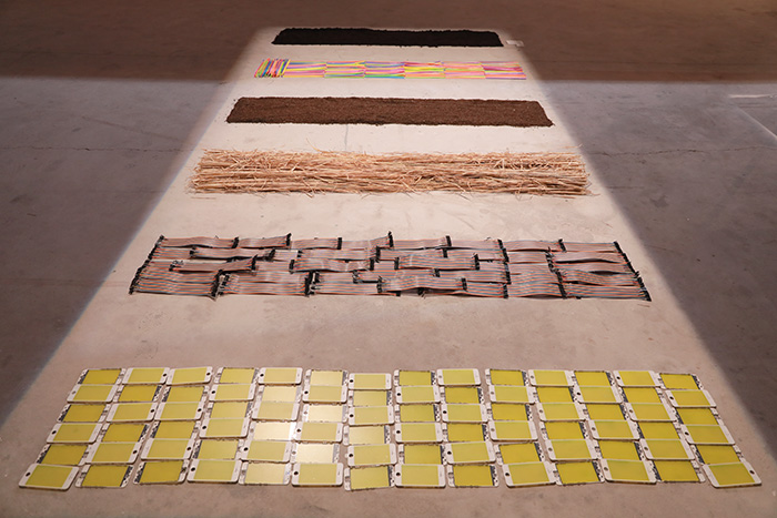 在展覽的一塊地面上整齊排列著稻草、烏衣紅粬、手機殼、杜邦線等物品,像一排排的斑馬線。這是王威的作品《人行道》,它是藝術家在徐岙底村駐村創作的成果。王威先後經歷了在徐岙底村、廈門、西安多地的展出和再創作。作品源於“地方”,始終將在地性視為重要驅動力,展出所在場所的地方屬性會被引入作品,建立在地連接,作品在不斷變身的過程中逐漸豐富。此次深圳展出的《人行道》是幾次地方性元素的集中呈現。
