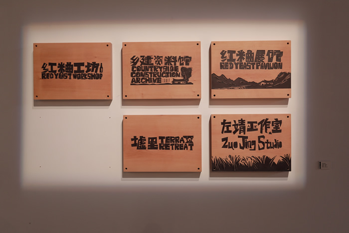 藝術家劉慶元的木刻作品貫穿了左靖的多個鄉村建設項目。他創作的徐岙底鄉村木刻遒勁厚重、生動諧趣、富於民間特色。本次展覽展示了劉慶元的《紅粬工坊》《鄉建資料館》《紅粬展館》《墟裏》《左靖工作室》等木刻標牌。