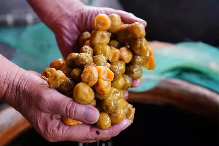 清末創立的“恒聚醬園”至今還保存的産品“冰花梅醬”,圖為在工廠中工作了50年的老師傅從缸中檢查發酵了數月的梅子醬。攝影:楊昶 2021年