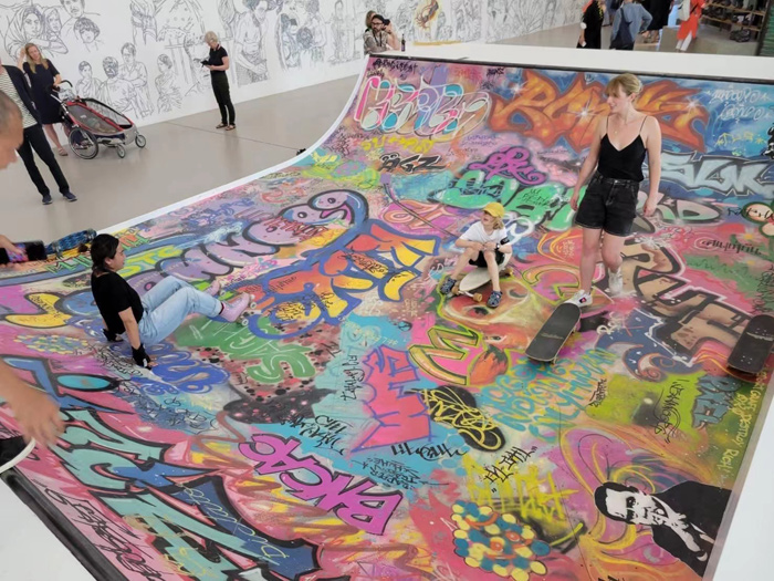 泰國的皮影戲多半以印度婆羅門教史詩《羅摩衍那》為主題,“翻攪乳海”是史詩中所描述的創世故事之一,裏面的其他內容也多與愛、情義、死亡相關。這些與生命相關的表演似乎也成為了為死去的奶牛所舉辦的儀式,來對比出不同文化下對於動物他者及自然資源迴圈的重視。滑板公園和協會的參與,則通過在文件展廳環繞皮影戲偶的空間中搭建一個u形滑板場並,繪製呼應主題的塗鴉,通過當地滑板社群在其中游戲時上下左右的滑動,來呼應上述由《羅摩衍那》中“翻攪乳海”的意象,讓各種跨越歷史與文化的事物在此交匯碰撞生。在展廳中建構出結合東西方文化與社會對話的意象,也是開放給觀眾一起遊戲、互相學習、交流與分享的場域。