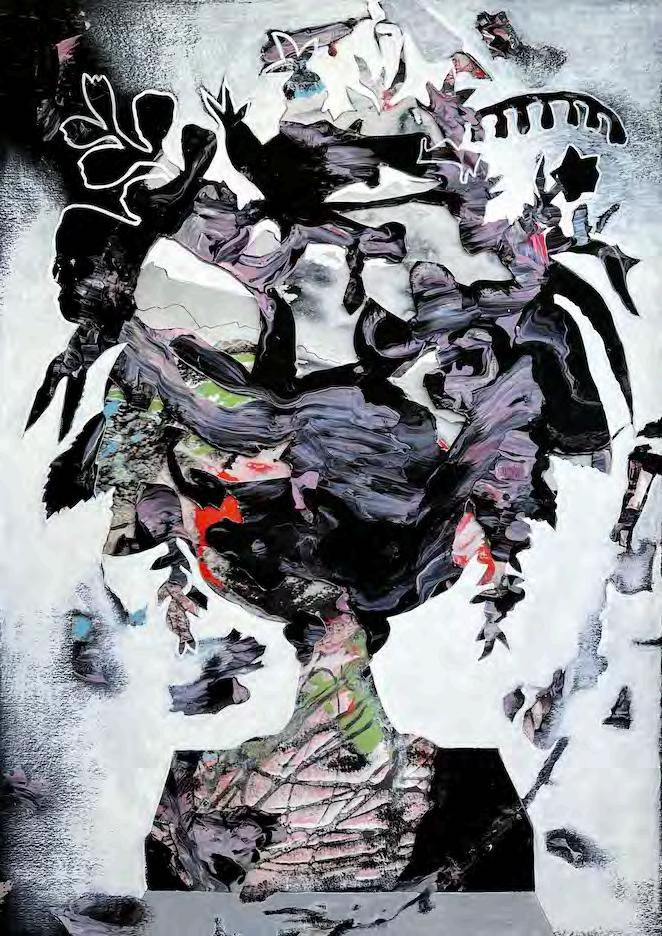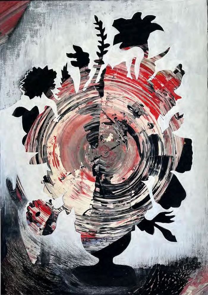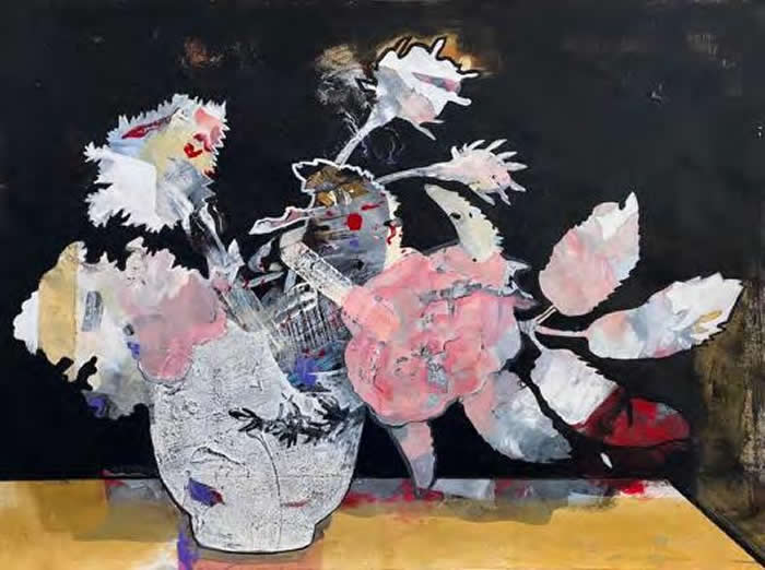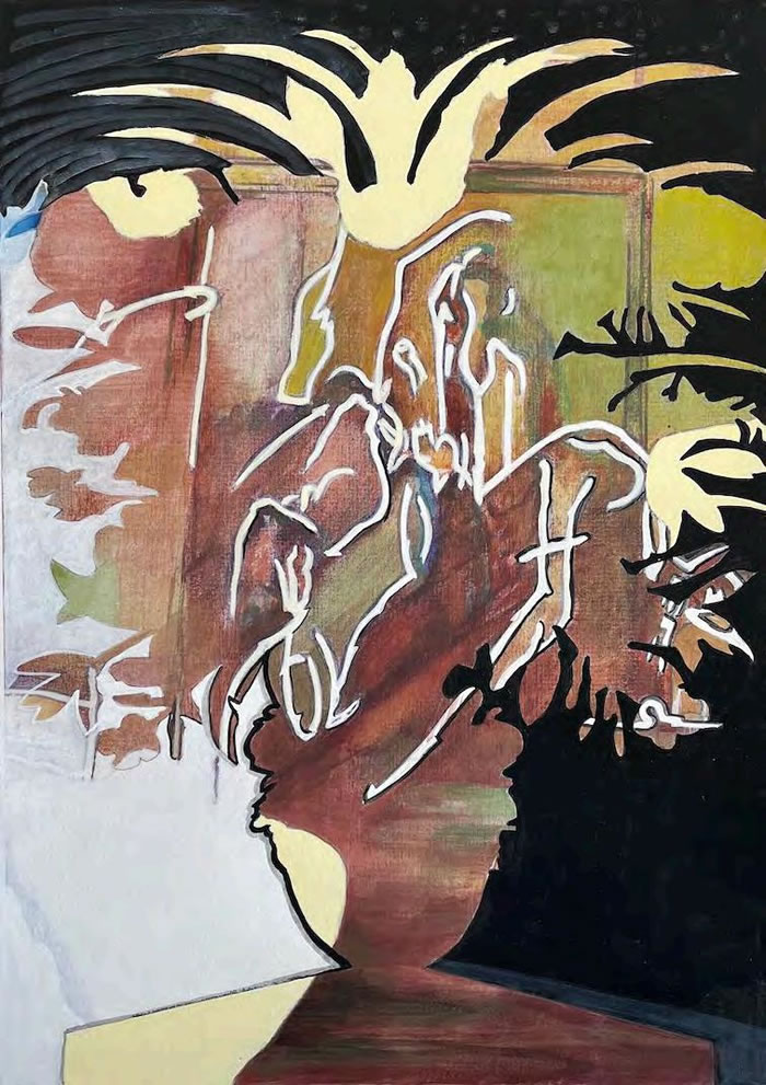 Because the bouquet as a concept is central to Lucienne’s recent artworks, her reference to the flowers themselves lies exclusively in the representation of their silhouette as a bouquet form in a vase. Contained within this outline are figurative or abstracted depictions of landscapes, women and myths that are sections of some of her previous paintings. In this way, each work is created by pairing a selected bouquet with a different underlay painting chosen because of its historic context and potential for both reflecting various moments lived and carrying new meaning forward. Paint is then applied variously inside and outside of this profile, uniting inner and outer in the present.