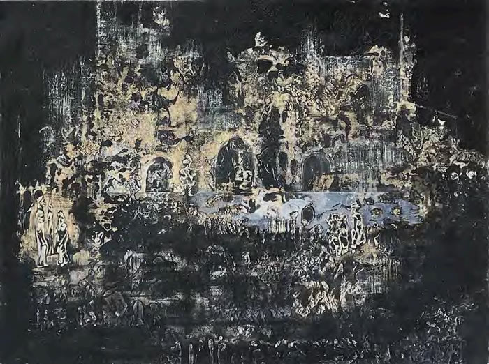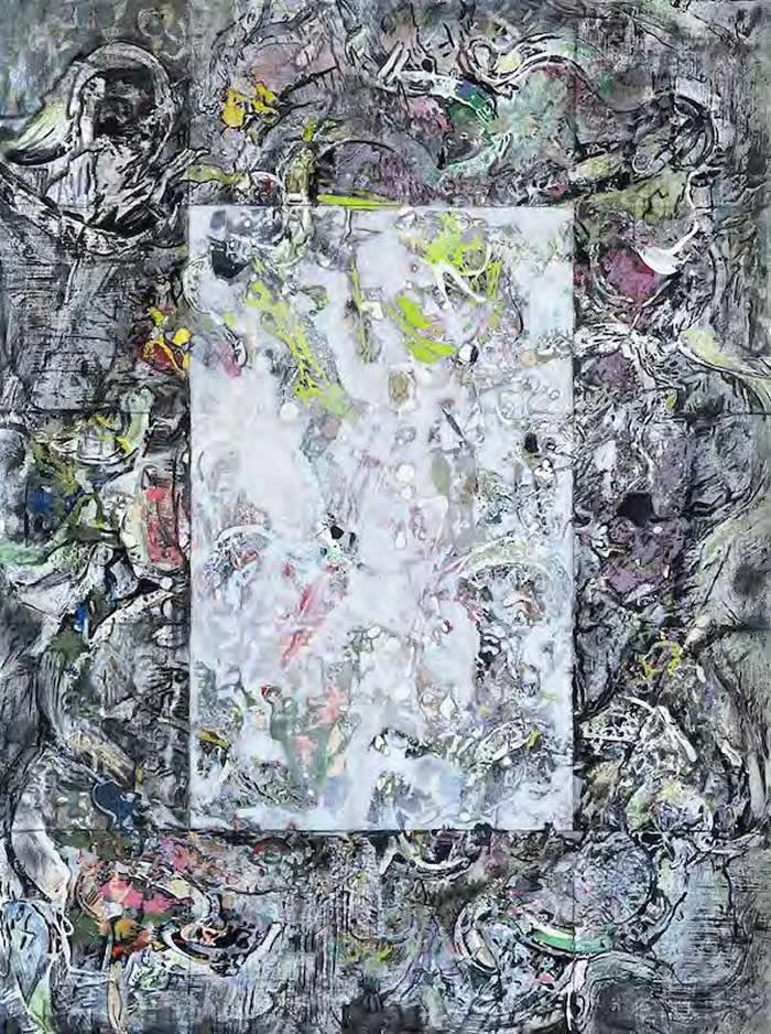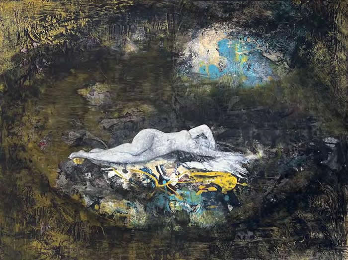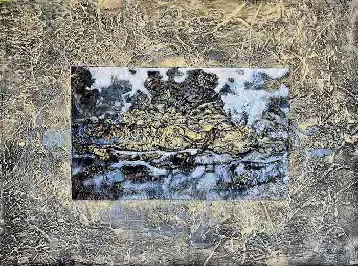 The paintings for this series are illusionary visual narratives about journeys into matter, an exploration into the substance of primordial landscapes—the watery expanses of the sea, its rocky islands, the dark unknown or at times exploited depths under the surface of the planets and our earth, the streaking sunlight across deserts to find an oasis either of the soil or mind. And beyond it all, the immensity of the cosmos, its planets, stars, asteroids, a dizzying continuous motion, the entropy of the universe. Sometime, small human figures appear within, being spectators of, witnesses to the unfolding stories that play out on this infinite stage.