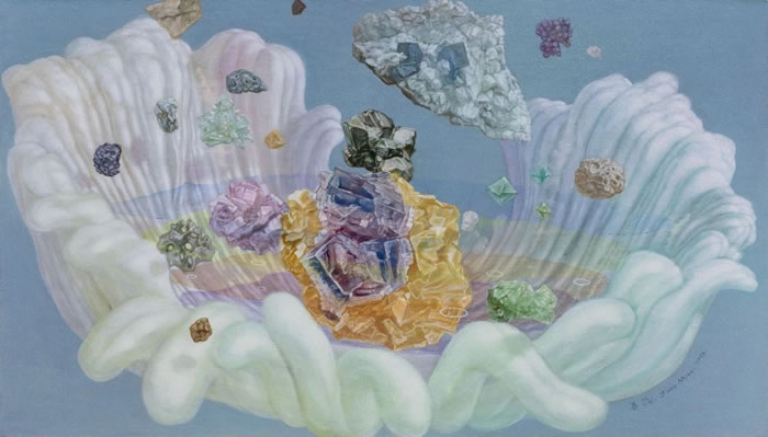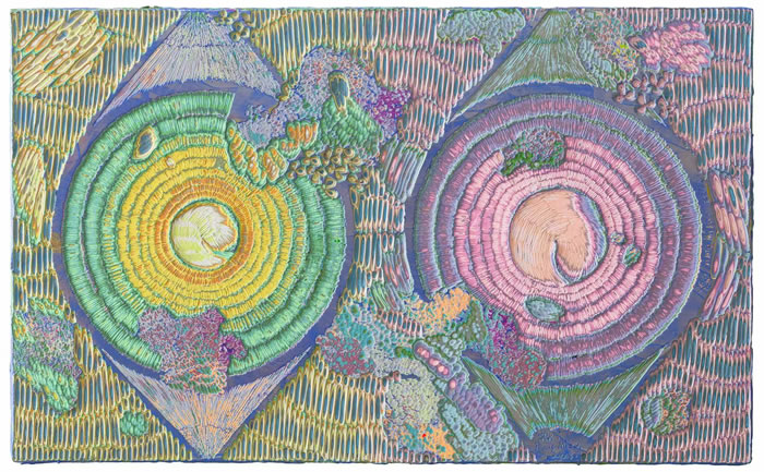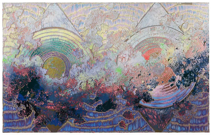 姜淼的作品是畫又非畫,山水又非山水,在她耗日費時所描繪的宇宙世界中,層層疊疊的色彩蘊藏著無限的時空與氣場,經過刻刀、畫筆下的表面語匯或符號,靜靜地釋放出生命的能量。