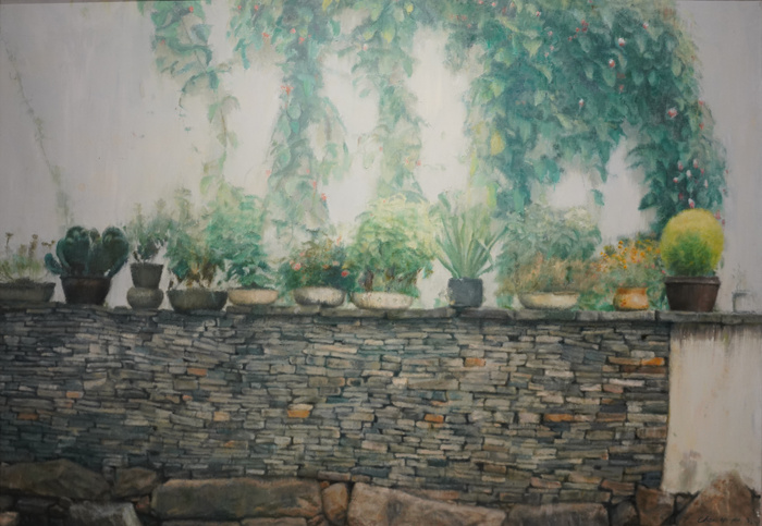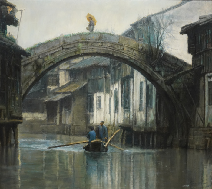 陳逸飛此次有四幅水鄉作品展出,分別為創作于1983年的《清晨》《後花園》《悠悠小船》,以及創作于1984年的《寧靜的傍晚》。