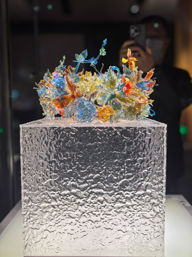 展品方面重點呈現了現當代琉璃工藝美術師通過吹制、脫蠟等熱成型工藝及內畫、雕刻等冷加工工藝製作成型的炫麗多彩的琉璃藝術品。有些作品將琉璃材質的“倣真性”發揮到極致,現場可見不少以琉璃製作成的花卉、蔬果、動物、山石等中國傳統觀賞類景觀,造型逼真,色彩艷麗,栩栩如生;有些作品則將琉璃作為綜合材料的一部分,體現出現當代琉璃藝術的先鋒和實驗意識;還有的作品致力於向傳統致敬,復刻經典。展覽現場,3位95後藝術家孫啟燁、鄒宇曦、陳玙強以國家博物館所藏既承鳳冠為原型,幾乎等比例復刻的琉璃作品《琉璃鳳冠》吸引了全場目光。作品中所有可見材質全部以琉璃採用燈工和編織工藝製作加工完成。