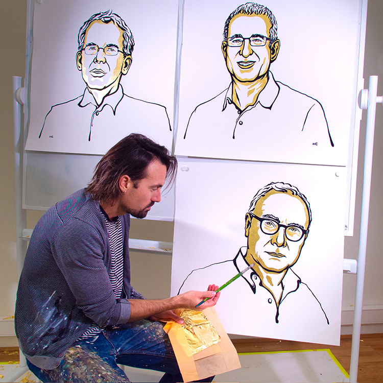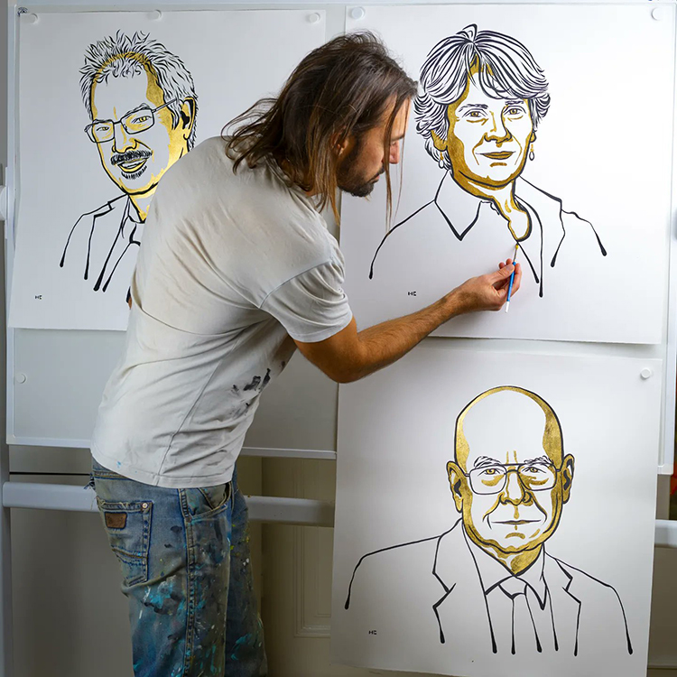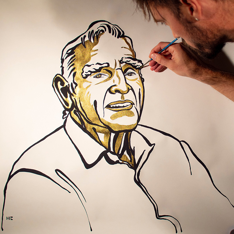 而在2017年時,諾貝爾獎委員會決定以金色呈現獲獎者名字,於是尼克拉斯從2018年開始將金色元素融入到肖像畫中。畫像上的金色部分使用的並不是普通的金色顏料,而是一種可以用特殊膠水涂在畫上的超薄金屬箔。這種獨特的繪製技巧,使得白色背景上的金色部分與黑色輪廓相映成趣,為畫像增添了別樣的魅力。