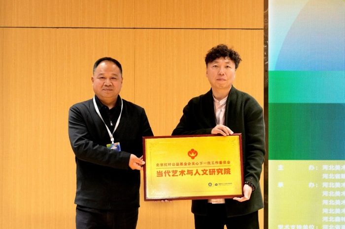 隨後,舉行了北京紅葉公益基金會關心下一代工作委員會當代藝術與人文研究院授牌儀式。中國關心下一代工作委員會教育中心原副主任、北京紅葉關工委主任黃殿龍為“當代藝術與人文研究院”授牌。
