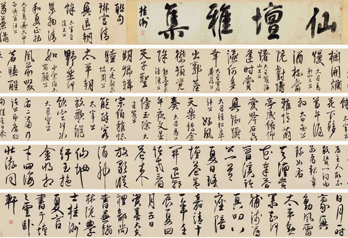 夏言(1482~1548)行書仙壇雅集詩,手卷 水墨灑金箋,嘉靖十一年(1532)作,引首:30×150 cm,書法:32×1104 cm