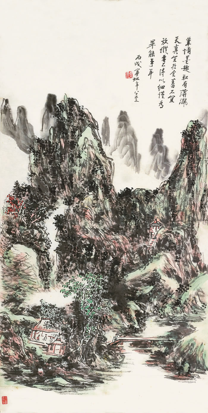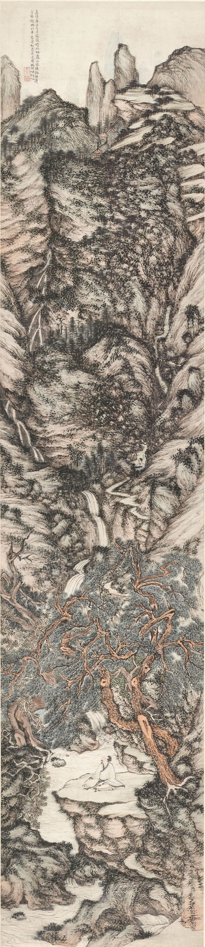 黃賓虹 溪山論道,鏡心設色紙本,丙戌(1946年)作,100.5×50 cm,約4.5平尺