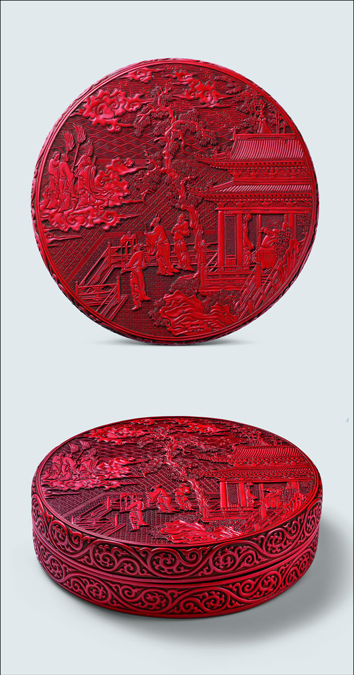 元 剔紅“吳茂造”唐明皇遇仙圖大蓋盒,盒蓋內側:“吳茂造”針劃款,盒底:“吳茂造”針劃款,直徑 D 27.2