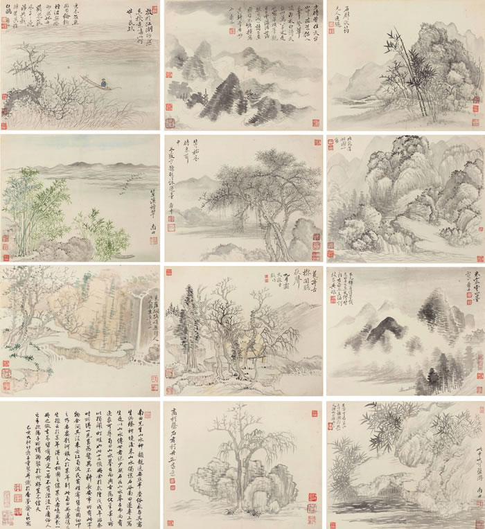 惲壽平(1633~1690)倣古山水冊,冊頁(十一開)水墨、設色紙本,畫:28.5×34.5 cm(每幅),跋:32.2×37.5 cm