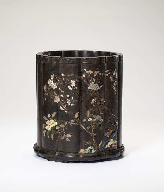 明孫克弘作紫檀百寶嵌詩文四時花卉葵口筆筒