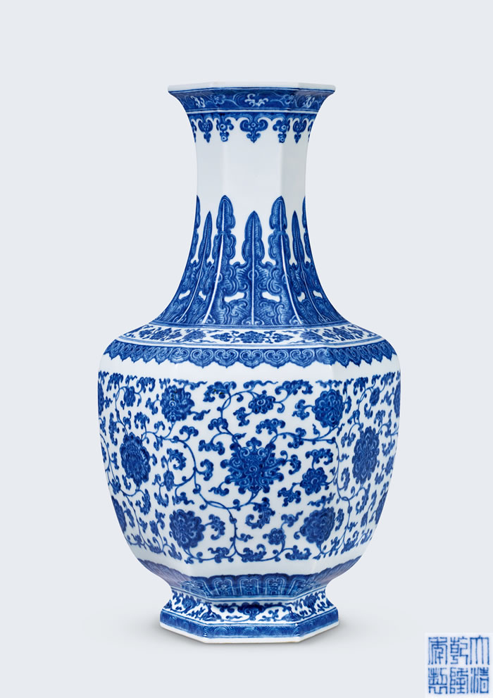 清乾隆 青花纏枝蓮紋六方大瓶 “大清乾隆年制”六字三行篆書款,乾隆本朝 H 47.3