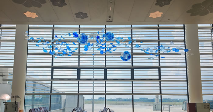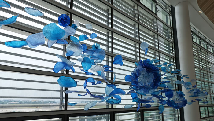 藝術家把整個嶺南的春天都挂在了天花板上:這些仿佛被南風吻過的藍色花瓣,藏著不少小心思——它們有著通花瓷般的玲瓏,又帶著麥稈畫的細膩,每一片都是非遺智慧與未來美學的混血兒。為了讓這場花雨真正“飄”起來,湖北美院藝術家團隊玩了個視覺魔術:用0.3毫米幾乎隱形的鋼絲繩,輕鬆吊起了整整3噸的裝置。最妙的還是花瓣的“變裝術”——特調的“嶺南天色藍”會隨著天光悄悄改變心情:清晨是暖金色問好,正午是天空藍微笑。表面那些精密的波浪紋理,更是在地上投下流動的光斑。這些會跳舞的花瓣告訴來往的旅人:機場的春天,從來不會落幕。