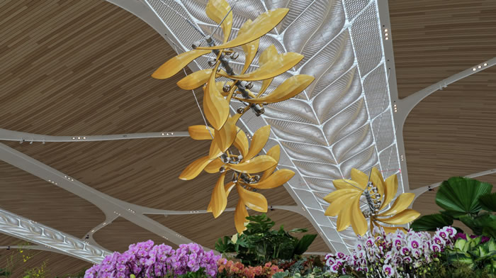 西安美院藝術家團隊從嶺南經典的滿洲窗中“借”來靈感的幾何線條,讓傳統花城的浪漫與飛機起降的現代節奏,在旋轉花瓣間美妙相遇。更神奇的是,這群花兒會“自己看天色”變裝:清晨披上暖金色,開啟明朗一天;正午換上天空藍,送來滿眼清爽。原來每朵花裏都藏著精密的“智慧大腦”,精密旋轉系統則帶來看得見的科技浪漫。