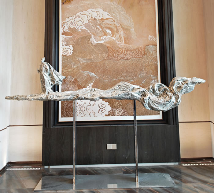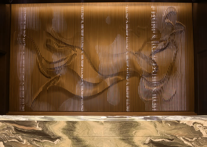 感受過光之宇宙的靜謐,再進入貴賓室小憩時,墻上有一面會“動”的魔法地圖——中央美院藝術家團隊把海上絲綢之路的輝煌歷史,“藏”進了一幅充滿嶺南韻味的青銅浮雕裏。內藏的智慧LED屏在代碼驅動下,會讓光芒如星圖般點亮,海浪開始流動,商船仿佛重新啟航。讓青銅的厚重質感與數字光影完美融合,毫無違和。靜態的浮雕與動態的光影,共同演繹了一場跨越千年的航海史詩。它不只講述歷史,更在向遊客低語:廣州的故事,從一開始,就是一場與世界的溫暖握手。