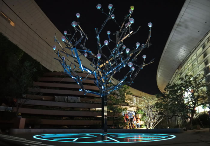 信步至東花園,一棵會“變魔術”的鏡面樹向空中伸展。它用鏡面“外衣”把花園繁花、流動雲彩和旅人的身影都“畫”進枝幹裏。廣州美院藝術家團隊用當代設計語言重新詮釋嶺南傳統園林的意境。當有人走近,腳下的感應裝置會觸發驚喜:數字化光影如枝葉般搖曳,亞克力花朵輕柔“呼吸”,漫天泡泡折射出夢幻色彩。這棵神奇的樹,用現代的方式演繹著嶺南園林“借景”的古老智慧。它不拒絕任何風景,用情歡迎每位路過的友人。