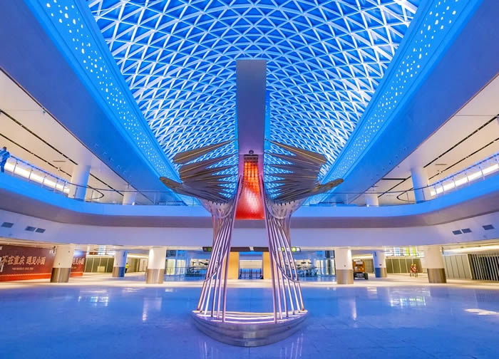 無論是出發還是抵達,都少不了一場溫馨的迎接。藝術家把廣東省鳥白鷴請到航廈,與飛機航線之美夢幻聯動:一隻身姿如嶺南山水般流暢寫意,一隻輪廓似機場鋼結構般利落分明。這兩隻數噸重的“大鳥”僅憑幾個隱藏受力點就實現懸浮魔法,鏡面羽翼實時倒映著航廈的流動風景,智慧光線還會隨著遊客的腳步玩起變裝秀,科技感十足。