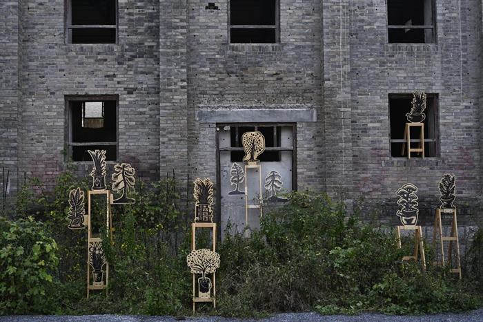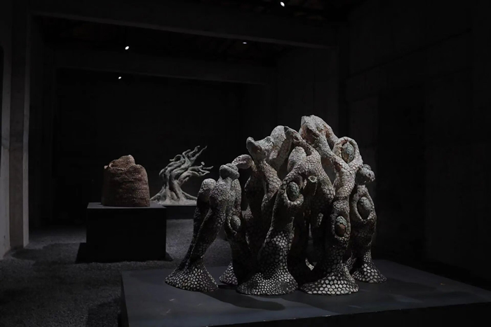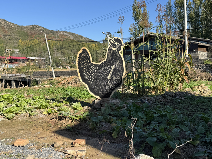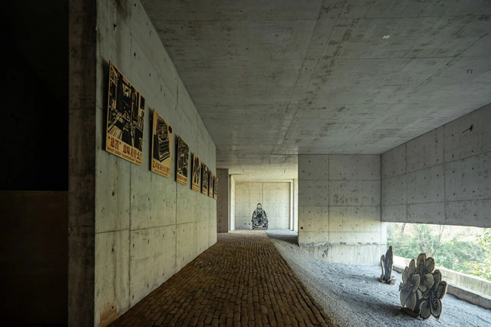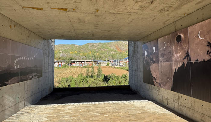 清水混凝土建築內正在展出劉慶元的《遊記木刻》與孫彥初的《顯山繪影》兩個展覽。劉慶元長期行走于鄉村田野,他將村民勞作、神祗與動植物形象以快速而精確的刀法一一刻出,生動而樸拙。劉慶元創作的動物、昆蟲與人物木刻被分置於清水混凝土建築的內外空間,在灰色墻面與沙礫地面的襯托下,作品體量感被放大,凝重且帶有超現實的距離。戶外草地上,一組花草木刻散落于荒草間,一隻巨大的雄雞木刻昂首面向村舍,自然與藝術彼此疊映,回應了他所言的“廢墟美學”。