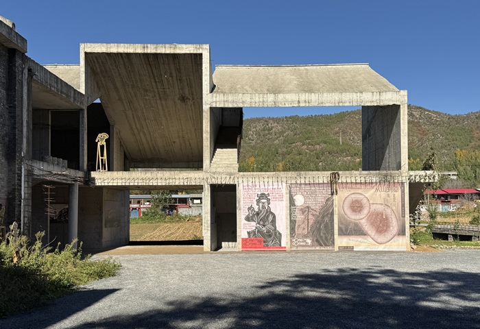 本屆南坡秋興的展覽設置在美學中心。這裡由原鄉村禮堂、新建的清水混凝土建築,以及禮堂對面的磚房合圍成一處院落。清水混凝土建築由建築師梁井宇設計,因外立面尚未完工,部分內部結構、墻面、樓梯與鋼筋裸露,呈現出一種直觀而鬆弛的結構美。窗洞、隔間與樓梯的多重穿透與分隔,為作品展陳提供了豐富的空間肌理與光影層次。