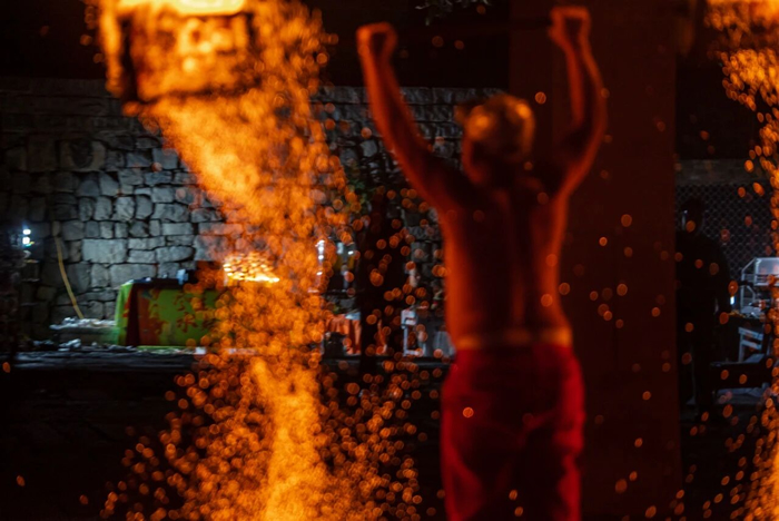 從孟泉村趕來的鼓舞隊,從村外一路擊鼓進入大南坡村。隊伍穿街過巷,村民紛紛走出院子,節日的熱鬧從這一刻開始蔓延。表演者楊亦可再次上演“火壺呈祥”。 這一次他脫去防火服,赤裸上身在火光中揮舞,古老祈福的儀式伴隨著觀眾陣陣的歡呼,把鄉村節慶的熱鬧氣氛烘托得更加火熱。