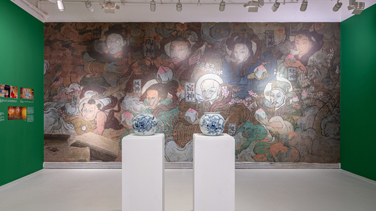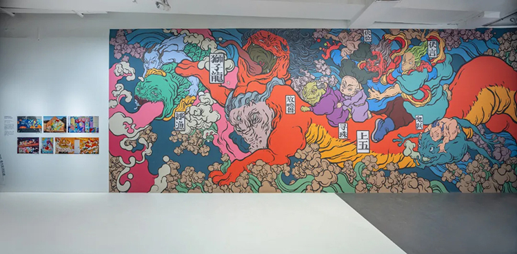 一樓的第四個展廳主要呈現文那的壁畫作品,在這裡,文那選了兩幅最具代表性的作品做大型墻面還原。《三寶賦》是文那在三寶畫的最大的一面墻,講的是三寶所處的自然環境;《獅子龍圖》是文那受法國當代藝術博物館之邀創作的作品,里昂的名字意為“獅子”,文那則從中國帶來一條龍,融合成這幅《獅子龍圖》。