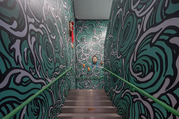展廳一樓走向二樓的樓梯被打造成一個海浪翻涌的世界,諸多神仙面孔在海浪中穿行。