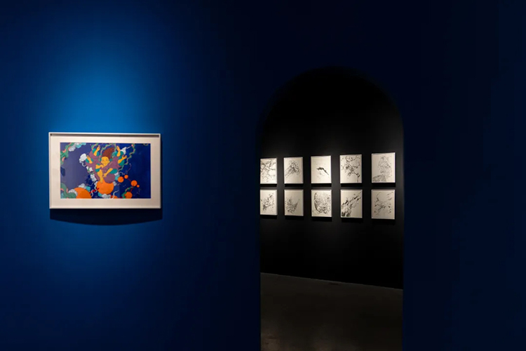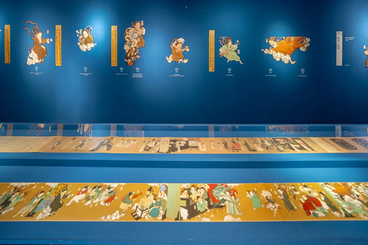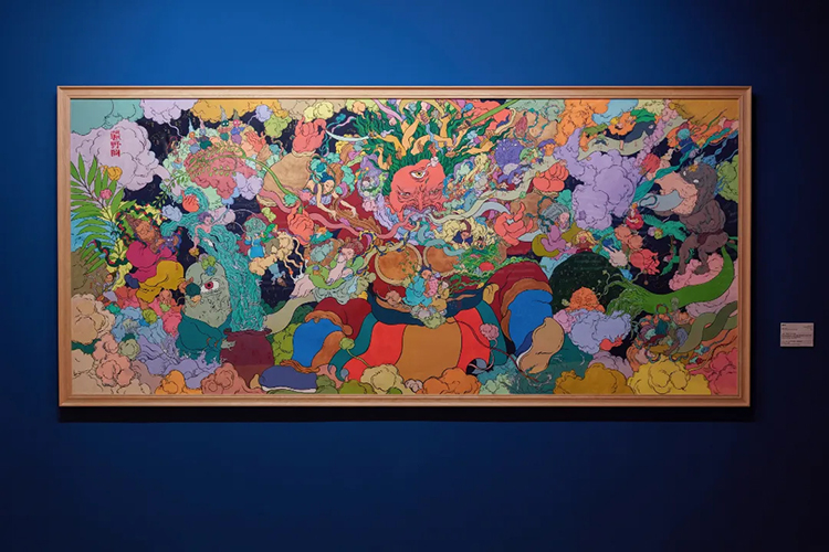 在展廳一樓最後的一個空間,展出的是文那對中國十大經典古畫中的《韓熙載夜宴圖》的再創作作品——《韓熙載宴仙圖》。畫作通過虛幻的場景和隱秘的敘事,呈現一個既令人驚嘆又疑惑的仙宴世界。