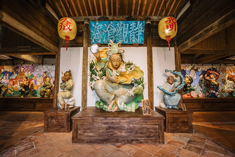 《藏海厝》是坐落在泉州晉江的一個真實的空間,也是文那近五年來最大的項目。該空間裏有20多個木雕和1幅巨大的壁畫,它講述了一個關於海上絲綢之路、關於僑民和海洋的故事。在本次展覽的二樓鏡面空間內,文那把這些形象都做了1/2的處理後重新展示。