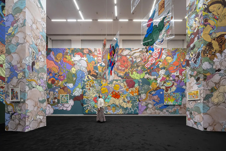 展廳的第一件作品是文那為此次展覽創作的《疆野圖》。這幅作品就像文那的一張大“創作地圖”,她將所有自己創作過的神仙和形象都畫在了這張畫裏:畫中主神嘴裏“吐”出的像雲彩一樣的路,是文那走過的不同道路和經歷,包括她畫的壁畫、各種跨界合作、在歐洲走過的國家和所做項目等。那些隨著時光流逝可能會消失的墻壁、可能被搬走的雕塑,都永遠地留在了這一幅畫裏,這是一張會隨著文那未來的創作被持續填充的未完結的地圖。