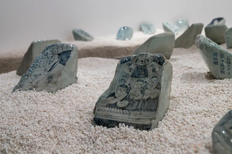 第三個展區的《百神鬥術碑》是文那早期在景德鎮耗時一個多月所創作的陶瓷作品,108位神仙,各顯神通,列陣鬥法。墻面上的72位傳統神仙與地面上的36位文那創作的“野生神仙”,傳統與新創融合一起,光怪陸離,亦真亦幻。