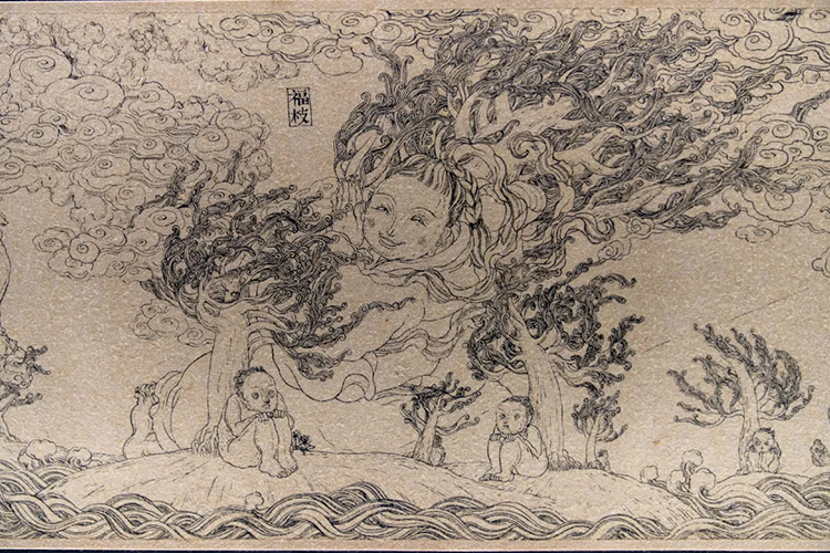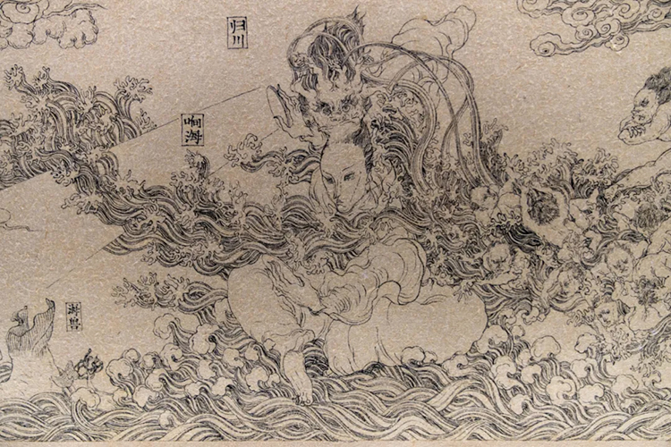 《暗道圖•擇木圖》是文那嘗試用長卷形式進行創作的作品,在連續不斷的構圖之中,她筆下的神仙們仿佛獲得了有機生長的空間,它們向前行進,逐漸衍生出屬於自己的故事。
