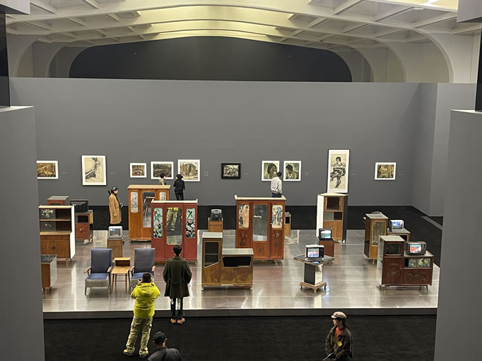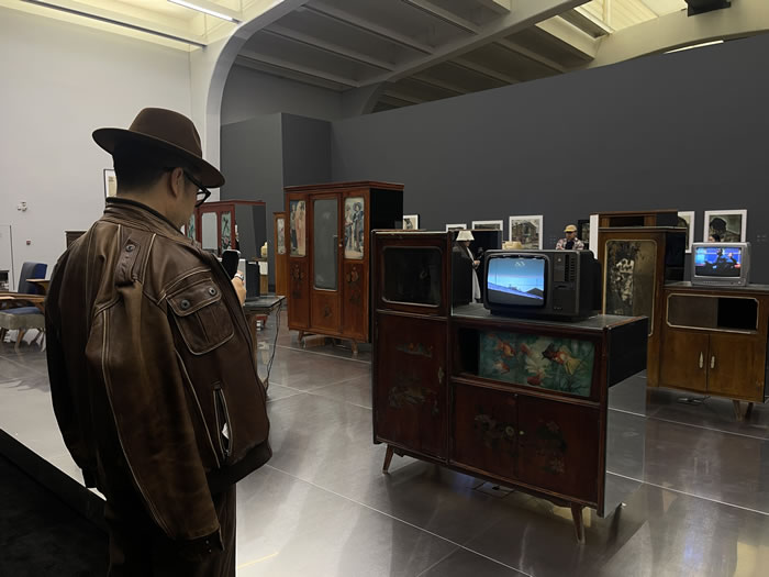 裝置《哺乳期》(2025)的主體部分由上世紀80至90年代香河地區常見的舊傢具和舊電視機組成,真實的影像記錄讓私人記憶延伸至具身空間。傢具被不同明暗度的鏡面和玻璃覆蓋,觀眾仿佛置身於一個如園林般幽微、時間失去坐標的流動空間。而舊電視機中播放著2000年初藝術家從上海回到香河老家拍攝的真實生活記錄的影像,這些未經佈置的畫面似乎構成了《香河》的某種前身。