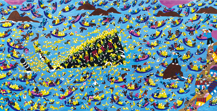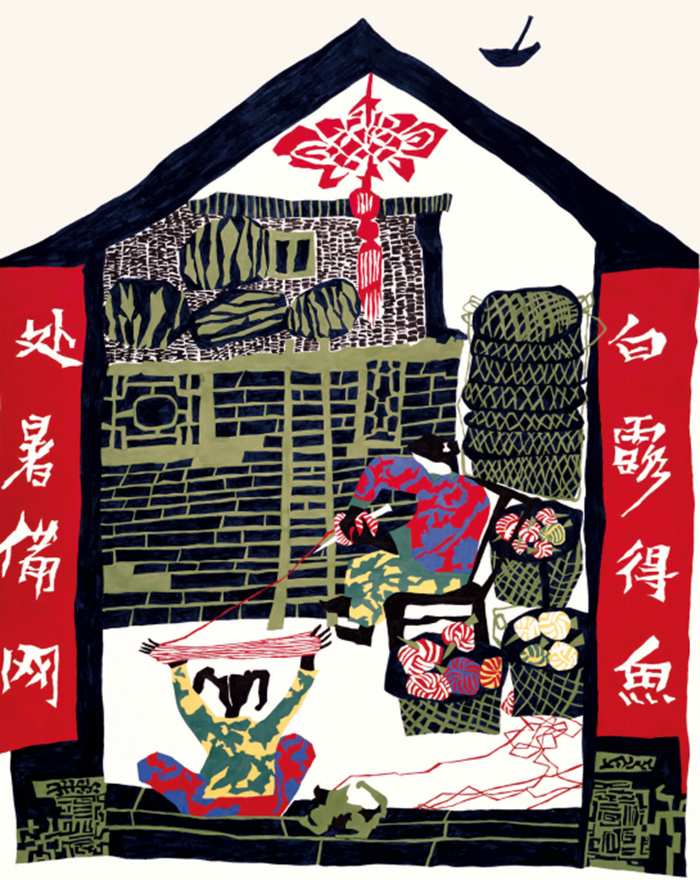 本次展覽以“海上的鄉土世界”為主題,共分“耕耘”“和美”“新曲”三個篇章。耕耘篇以“海上牧歌”為韻,26件作品將目光投向波濤之上的勞作與守望。作品以充滿本真之美的筆觸,將不同時空的勞動場景巧妙並置,讓日常的漁業勞作昇華為人與自然的精神對話,在平塗色塊間流淌著同舟共濟的淳美鄉風。