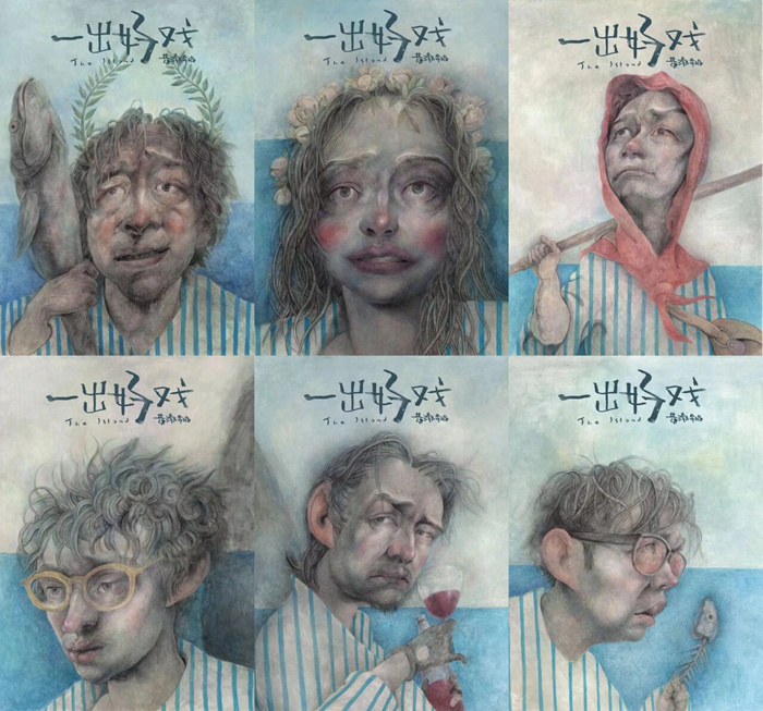 《一齣好戲》系列人物手繪海報,邱炯炯,2018年,紙上綜合材料,53 × 42釐米,鳴謝:黃渤(此系列由邱炯炯受導演黃渤特邀為《一齣好戲》主要角色手繪人物海報,分別為:黃渤、舒淇、王寶強、張藝興、于和偉、王迅)