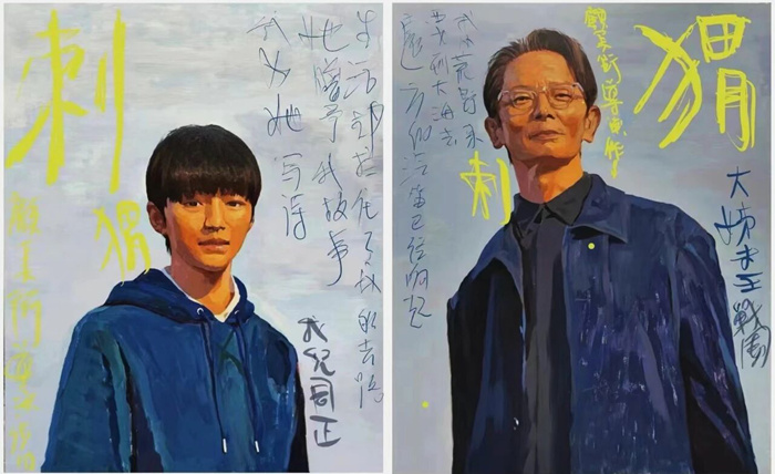 耿樂《刺猬·我兒周正》《刺猬·大姐夫王戰團》,演員王俊凱、演員葛優,2023年,丙烯畫,80 × 100 cm,鳴謝:藝術家