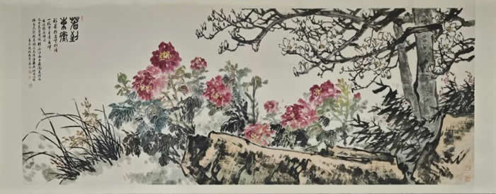 浙江大學教授、杭州市文聯名譽主席、浙江西湖書畫院院長、新華江南詩書畫院終身學術顧問杜高傑,與中國美術家協會會員陳培林合作為本次雅集創作大幅國畫《春到東衡》(主辦方供圖)