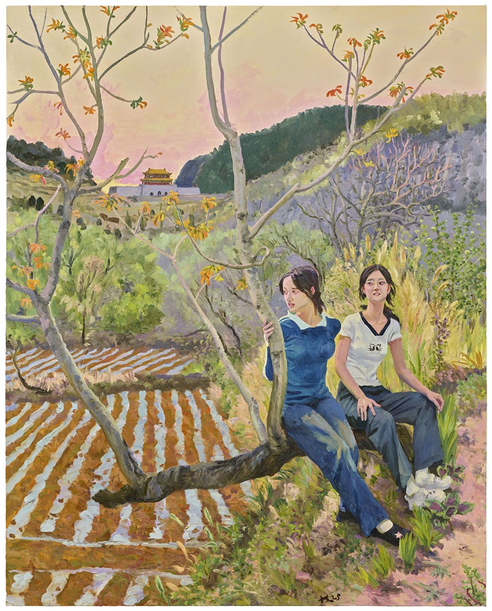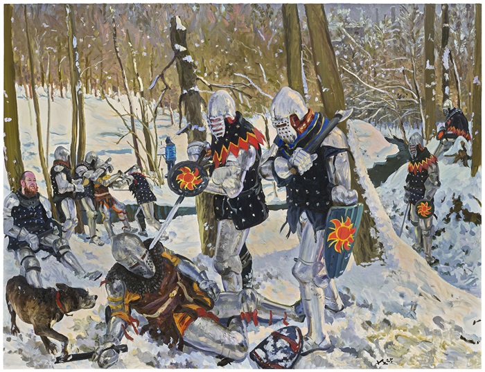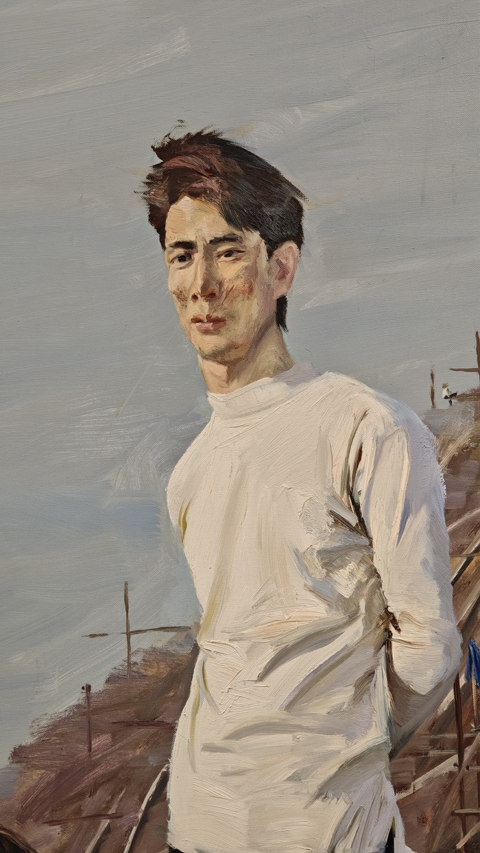 在2025年的新作中,他又去了底特律這座曾經輝煌的“鋼鐵之城”。《底特律雪光》是一場裝扮遊戲,是寒冬中的戰鬥,是對中世紀的模倣,他們把身體隱藏在保護之下,整幅畫只有一張露出的臉。他覺得油畫是一種古典的媒介,很適合畫金屬。他還用多層敘事表現事件的推移。《天門關》展現了太行山區新一代青少年的形象。他改變以前印象派的色彩體系,轉而表現主觀的固有色,但他仍然展示出控制色彩關係的強大能力,洋溢著青春感。