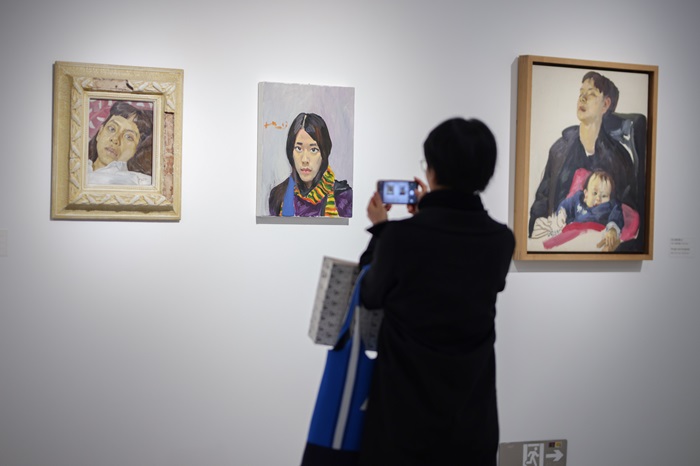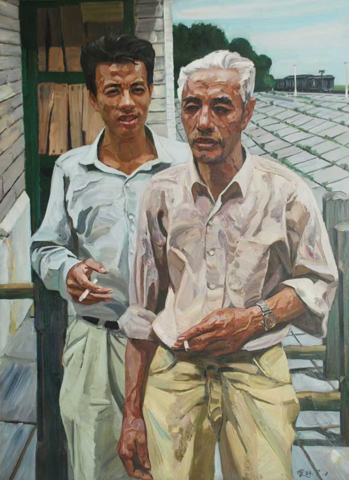 他在作品中常常描繪家人,這既體現了溫情與致意,也是對自身、對時間的思索。家人同時是他作品的觀眾,給他以支援與鼓勵。他們是照見自我的鏡子,也是精神的港灣。《父子》中的父親像一座山一樣沉著冷靜。背景的火車站臺承載了遠行又回歸的記憶。《老媽》洋溢著溫暖的氛圍和豐收的喜悅,母親照看著茁壯的蔬菜,令人感到踏實。他對喻紅和女兒的描繪注入了細膩的情感,成為他創作之路上一條綿延的線索。