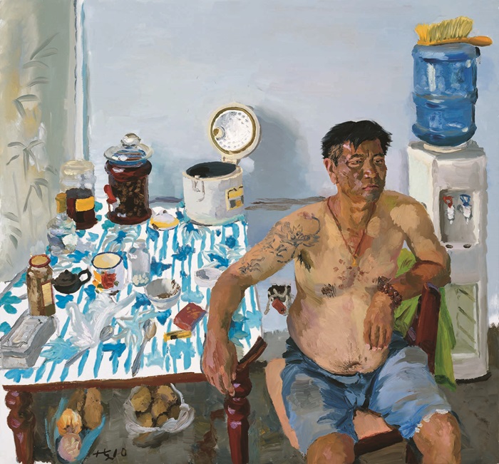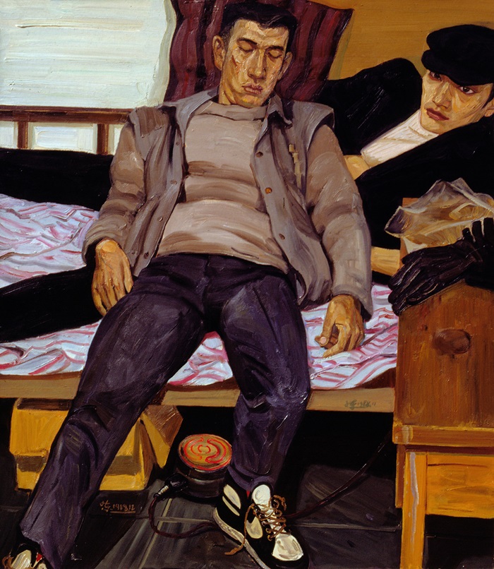 在這一時期的創作中,劉小東把極多的筆墨放在深入刻畫人物的形象和狀態上,筆調嚴密而堅實,他以自己的朋友們為模特。人物在畫面中佔據了核心地位,視點距離模特很近,人物甚至超出了畫幅。作品尺幅不算大,但都包含了豐富的元素、空間關係和資訊。這時的作品甚至是“擁擠”的,總是處在一個狹小的日常空間內,像一個親友聚會的“密室”,蘊含著情緒的張力。