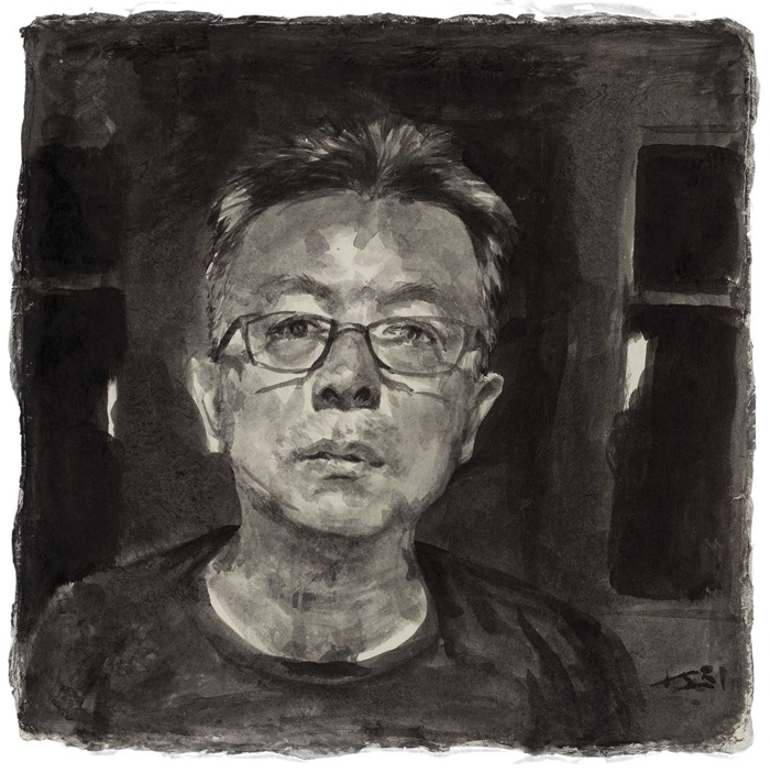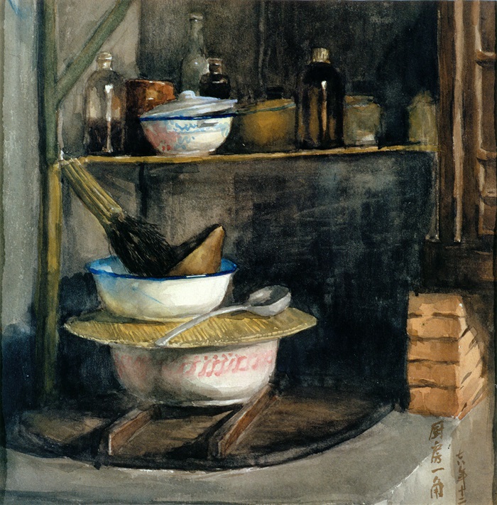《廚房裏的自畫像》,紙上水墨,2021,31×31cm