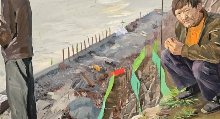 在《三峽新移民》中他借鑒了李公麟《海匯圖》的V形構圖,大面積留白,視野開闊,描繪了蓄水後煙波浩淼的三峽工地,主角是曾在此生活的普通人,包括玩耍的孩子,有些人好奇地看向觀眾,似乎對這個超級工程渾然不知。劉小東把他們從生活的環境中抽離,放進場景中。他在創作時也會參考照片素材,因此會發現人物會有一種與畫面的“縫隙”和跳脫感,半空中突然出現一隻野鴨,這恰恰是劉小東想要展現的超現實一面,使他所描繪的現實更加多維度地展開。